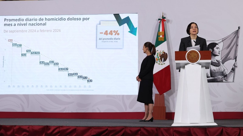 Las cifras fueron detalladas por Marcela Figueroa, titular del Secretariado Ejecutivo del Sistema Nacional de Seguridad Pública, quien explicó que el promedio diario de asesinatos pasó de 86.9 en septiembre de 2024 —último mes del gobierno de Andrés Manuel López Obrador— a 48.8 en febrero de 2026.
